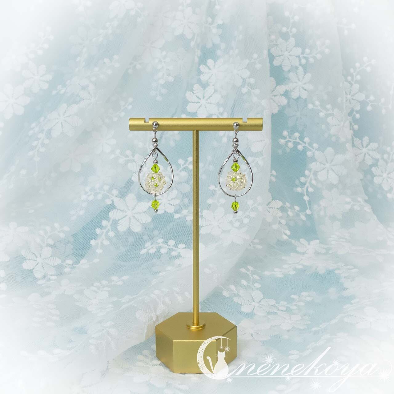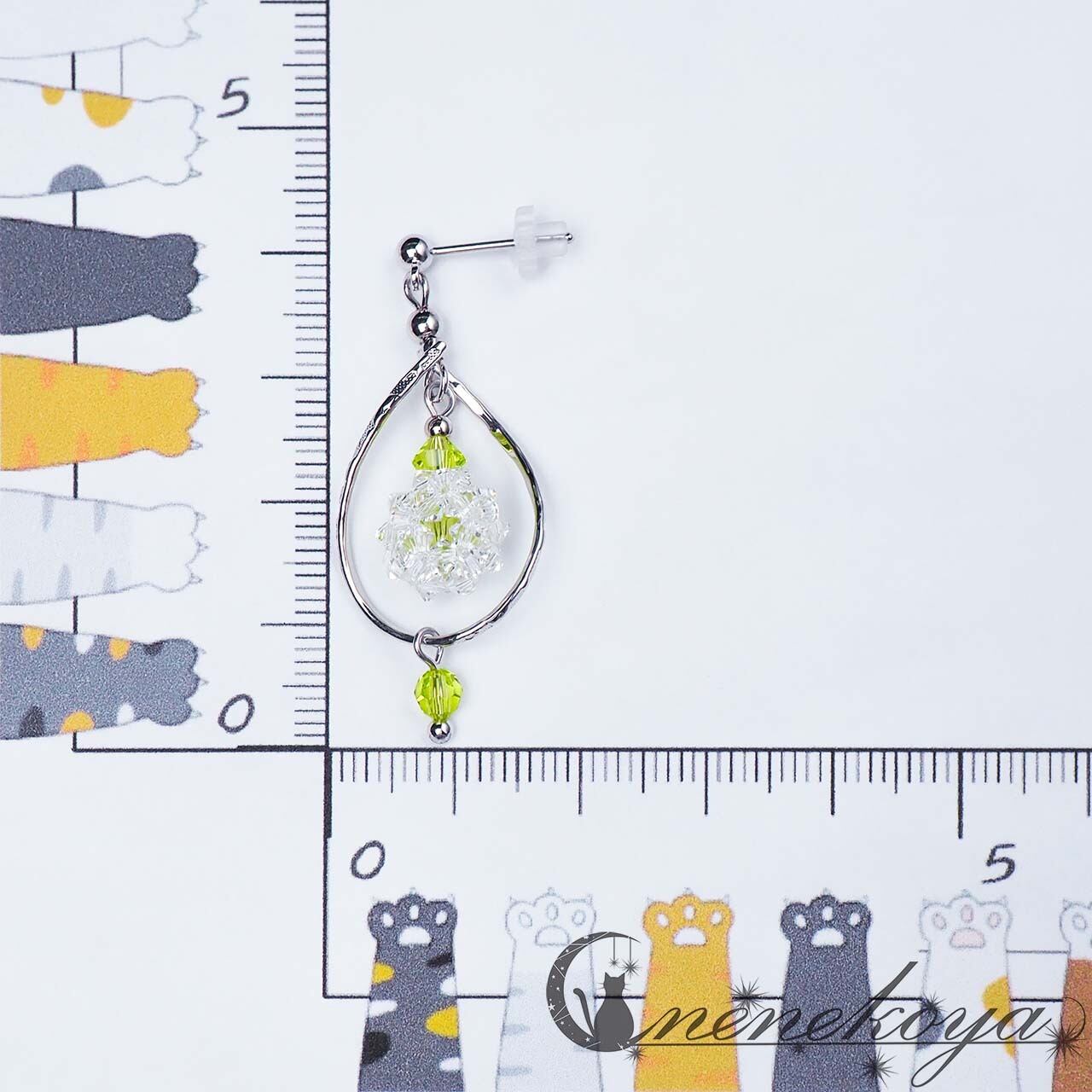 爽やかなシトラスグリーンカラーのクリスタルがアクセントに。ドロップリングにぶら下がる小粒のクリスタルも可愛く揺れます。